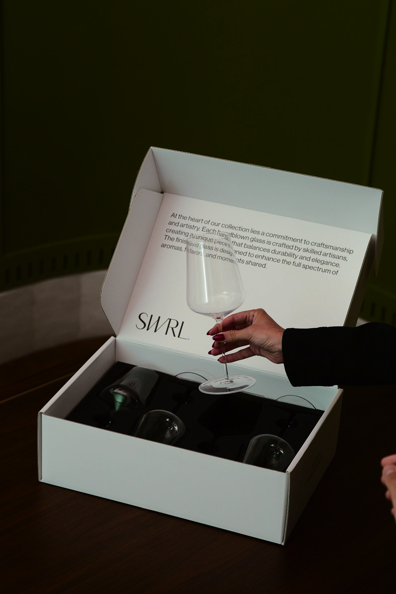 A considered introduction to the SWRL collection. This four-piece set includes one of each of our signature hand-blown glasses: theVersa, designed to suit nearly any wine; theBurgundy, with a generous bowl to reveal nuance; theBordeaux, structured to balance boldness and finesse; and theChampagne, elongated to preserve every effervescent detail.